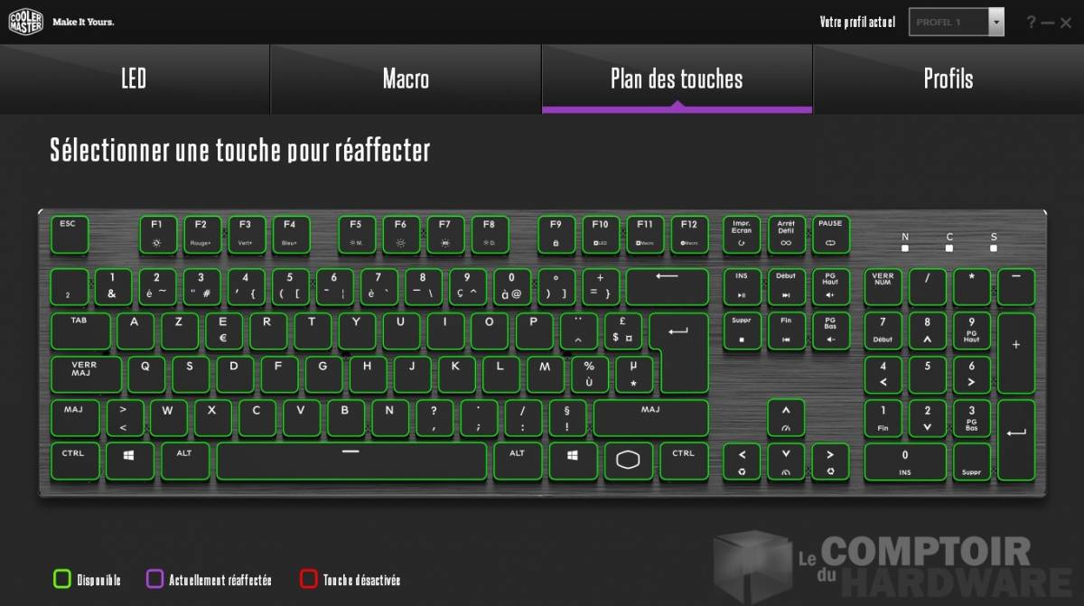 On retrouve le Cooler Master Portal, l'utilitaire maison pour les gérer tous (le matos compatible, bien entendu). Toujours aussi clair, lisible et bien organisé, le CM Portal ne déborde pas l'utilisateur de fonctions inutiles et futiles, et va donc droit à l'essentiel. Sur la page d'accueil, il suffit de sélectionner le périphérique que vous souhaitez personnaliser afin d’accéder à ses options de personnalisation. C'est aussi sur cette page principale que pourrons se mettre à jour firmware et pilotes - requise pour tout nouveau périphérique avant de pouvoir passer à la phase de personnalisation, un processus rapide et sans prise de tête. Le reste de la gestion est simple : choisissez un profil, modifiez-le, puis enregistrez-le. Pour information, l'exe de l'utilitaire pèse tout juste 10mo, utilisera 17mo à l'usage (notons que le gestionnaire des tâches Windows le nomme "Protal", une faute de frappe ?), tandis qu'un petit service nommé SK650 HID traînera en arrière-plan après fermeture du CM Portal à hauteur de 4,6mo d'utilisation de mémoire vive. Ça reste loin, très loin de certaines usines à gaz de la concurrence !