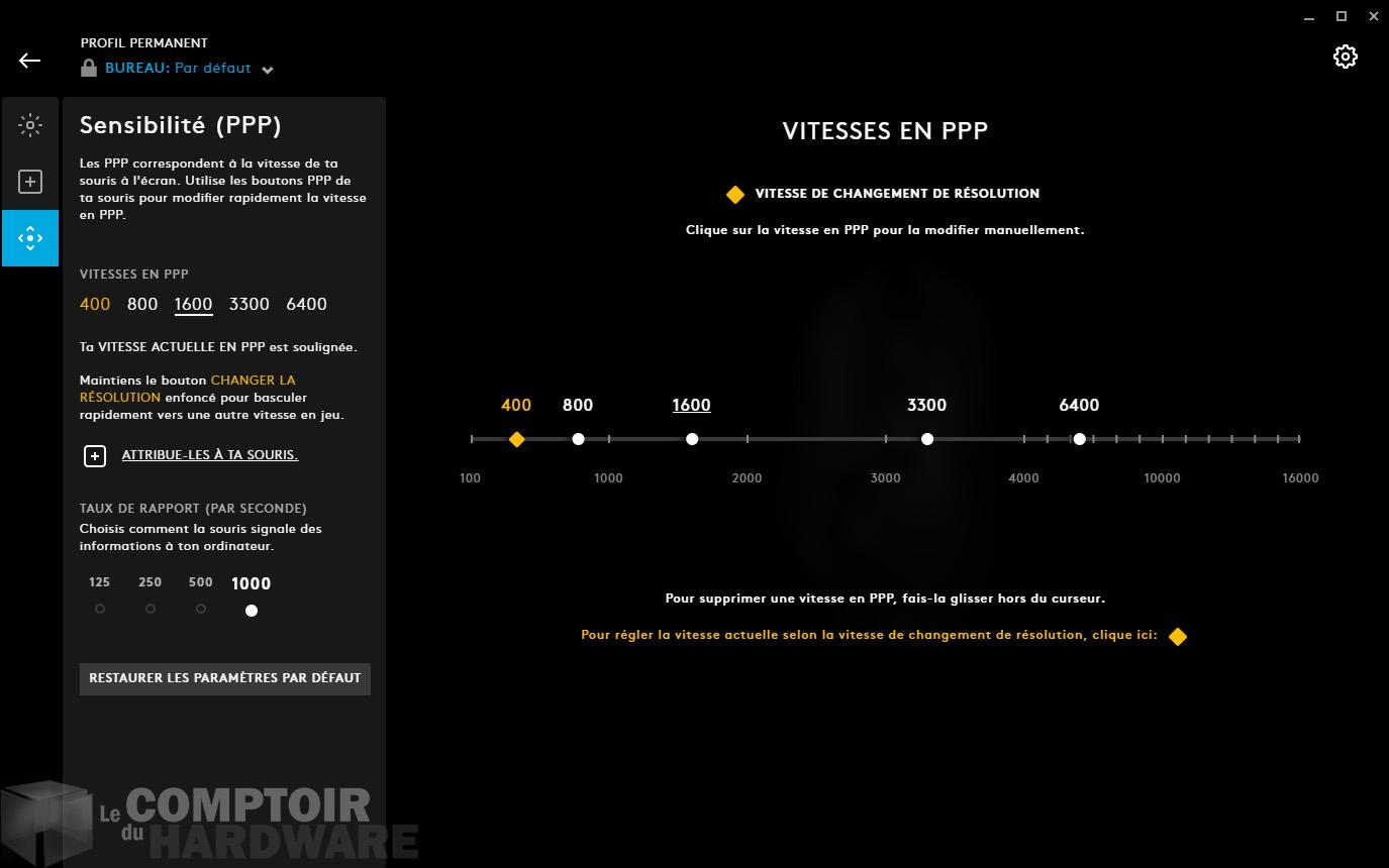 La section Affectation permet de changer individuellement le rôle de chaque bouton et de choisir parmi les listes (personnalisables) de commandes, touches, actions, macros et de fonctions du système (comme affecter le lancement d'une application à un bouton spécifique). C'est assez clair et plutôt simple à prendre en main. La sensibilité de la souris se paramétrera via le dernier onglet. Par défaut, la G502 LightSpeed propose des DPI à 400, 800, 1600, 3200 et 6400. Le réglage plutôt précis se fait par pas de 50 et peut évidemment s'envoler jusqu'à 16000, 100 étant le minimum absolu. C'est sur cette page aussi que l'on peut régler le taux de rapport de la souris par défaut sur 1000Hz, finalement un paramètre dont très peu se serviront probablement, mais qui continue à exister.
