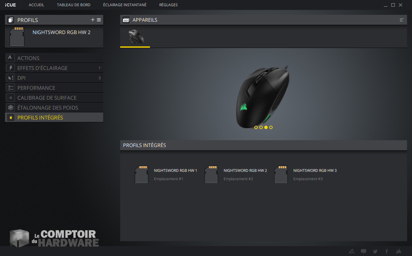 Notez que le profil par défaut n'est lancé qu'à l'exécution automatique d'iCUE et non au démarrage du mulot, ce qui engendre d'ailleurs le bruit caractéristique d'un périphérique débranché sous Windows ; et sous Linux, il faudra faire avec les données stockées dans les trois profils matériels, épicétout ! À noter également que vous pouvez supprimer les profils matériels, et qu'il faut alors quitter totalement le programme pour les réimporter depuis la souris.