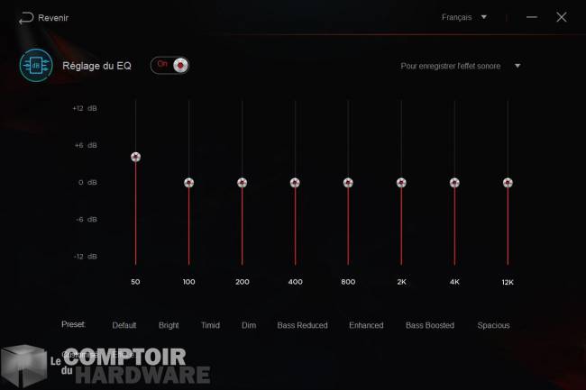 Les fonctionnalités logicielles fournies avec le Spearhead VRX sont basiques avec la gestion du RGB ou les presets de l'égaliseur, cependant nous retrouvons également un gestionnaire de la position de la tête et un outil de contrôle de la quantité de basses injectées dans le son. Le suivi de la position de la tête est assez bluffant et permet d'adapter le son qui sort en fonction la position de votre crâne face à l'écran. Un outil simple pour calibrer la position relative du casque est disponible sur le logiciel du fabricant et reste simple d'utilisation, le reste de la fonctionnalité est implémenté en natif depuis le driver. Toutefois, bien que le rendu impressionne beaucoup, l'intérêt est assez limité en général et fait un peu office de gadget, car l'écran, lui, ne suivra pas en conséquence.