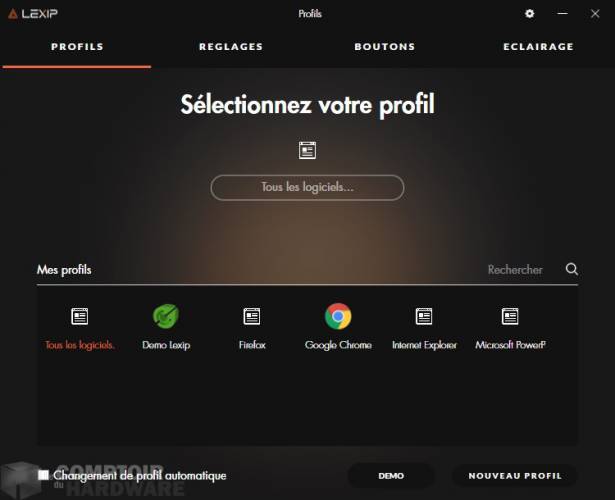 En tout cas, c'est ici sur la page principale que vous pouvez créer des profils pour chacune de vos applications. Il n'y aurait pas vraiment de limite sur la quantité de profils que vous pouvez créer (c'est un peu fastidieux, on a donc abandonné l'idée d'essayer d'atteindre au moins 99). Aucun réglage de la précision du capteur ni du taux de rapport n’est proposé. Certes, ces paramètres ne sont pas indispensables, et de toute façon, n'oublions pas qu'il s'agit d'un capteur d'entrée de gamme.