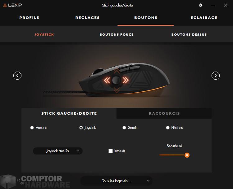 Au premier abord, l'interface est très propre et claire. Néanmoins, on se rend aussi assez vite compte que c'est un peu le fouillis, avec plusieurs sous-menus et catégories pour chaque bouton, une gestion du DPI un peu étrange et un réglage un peu déroutant du joystick. Aucune bulle d'information n'est accessible et on l'on doit donc deviner soi-même le fonctionnement du logiciel. À l'avenir, un peu de rangement et d'optimisation ne seraient pas de refus.