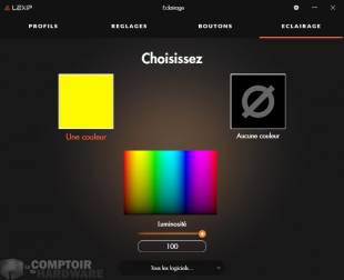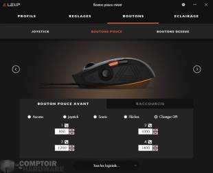 La personnalisation du DPI n'est pas forcément des plus intuitives, le réglage permet de fixer jusqu'à 4 échelons. Aucun indicateur n'est présent sur la souris pour afficher le niveau actif, mais ça, très peu de mulots le proposent de toute façon. Toutefois, une notification popup de l'application eut certainement été sympathique, même si ce n'est pas indispensable. Qui sait, Lexip ajoutera peut-être cette fonctionnalité au fil des mises à jour de son logiciel. À ce propos, les maj ne sont pas automatiques ni forcées, une icône apparaîtra tout simplement en haut à droite dans la fenêtre dès qu'une nouvelle version est disponible en téléchargement.