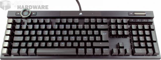 Esthétiquement, c’est facile, Corsair a pris 0 risque ! C’est-à-dire que le K100 reprend à 99,99 % les lignes des prédécesseurs, K95 et les autres — l’avantage, c’est que ça permet toujours de reconnaître un clavier Corsair au premier coup d’œil. D’un autre côté, on peut dire que le design est toujours au goût du jour, ni très discret ni trop m’as-tu-vu, subjectivement c’est toujours un bon équilibre. Et puis que pourrait-on vraiment attendre de plus de la part d’un clavier moderne ? Bien entendu, les amateurs intransigeants de nouveautés à tout prix seront peut-être déçus de l’absence d’évolution de ce côté-là. Mais le K100 cache son jeu ailleurs ! Il reprend aussi du K95 ses boutons multimédias dédiés sur une portion surélevée en haut du pavé numérique, ainsi que la molette de volume située à proximité. Ces éléments sont de bonnes factures et de bonnes tailles, la molette au roulement libre offre une bonne résistance. Ensuite, le K100 se démarquera par la présence des voyants lumineux habituels au centre du clavier, plutôt qu’à droite ou au-dessus des touches directionnelles. Les indicateurs sont désormais planqués sous une surface lisse, de part et d’autre d’un logo Corsair illuminé. Enfin, on notera l’apparition d’une bien grosse molette dans la partie supérieure à gauche du clavier, entre les boutons de sélection de profils et de verrouillage de la touche Windows que l’on trouve déjà sur les claviers précédents du constructeur. Cette molette est donc l’une des nouveautés introduites avec le K100, nous verrons plus tard quel est son rôle exact.