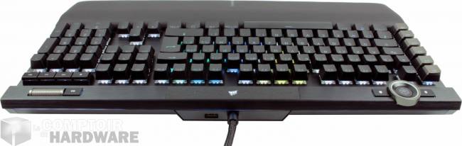 Comme sur le K95, les capuchons sont en PBT double injection, en théorie un gage de qualité et de durabilité. Notez que le K100 est livré avec des capuchons supplémentaires gris et texturés, prévus pour remplacer les capuchons des touches les plus exploitées par les joueurs. Leur surface dispose aussi d’une forme un peu plus prononcée pour encore mieux épouser le doigt respectif qui s’y posera. Accessoire, mais sympathique, tout comme la présence d’un relais USB 2.0. Certains regretteront peut-être que les capuchons des raccourcis « G » ne soient plus texturés comme sur le K95, mais lisses.