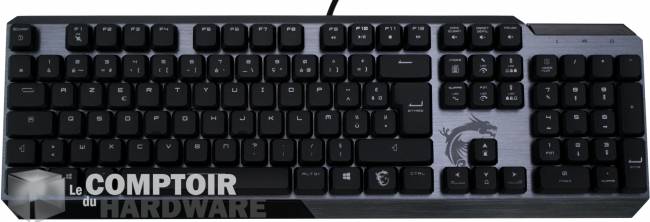 Après le passage sous les caméras vient le temps de test en lui-même, et c’est là que les questions subviennent : pour un design clairement orienté pour les joueurs (renforcé par la présence de l’anti-ghosting et du N-Key rollower), le modèle qui nous est parvenu est équipé de Kailh Tactile, un clone des Cherry MX Blue, sur lequel nous reviendrons plus en détail. Or, ce type d’activateur est habituellement réservé aux dactylographes, comprenez que le « clic » audible, la précourse nécessaire à l’activation et l’ergo clairement sensible ne sont pas les armes du gamers à la recherche de l’optimisation de la moindre milliseconde de latence entre la frappe et sa prise en compte sur un jeu compétitif. Un choix étrange donc, qui peut se résoudre par deux hypothèses : soit MSI cherche à réaliser ici un clavier polyvalent, capable d’en mettre plein les yeux sans pour autant délaisser les sensations de frappe de long texte ; ou la firme a considéré que le low profile, entrainant de facto une distance d’activation plus courte, suffisait en soi pour jouer, sans pour autant chercher davantage.