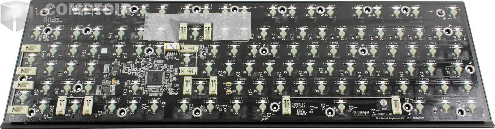 Et hop, la face cachée du PCB, où se trouve le reste de l'électronique pour l'USB, le RGB et toutes les fonctions du clavier, et c'est bien une puce ARM de chez STMicro qui est aux commandes de l'ensemble. Encore une fois, la propreté de la conception est exemplaire, mais c'était certainement indispensable pour pouvoir prétendre à la certification IP56.