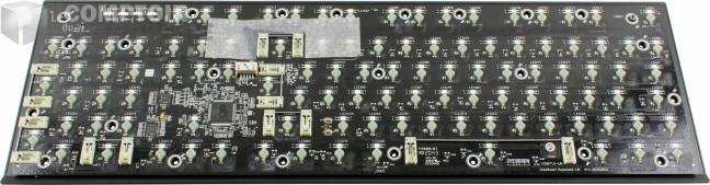 Le PCB a été travaillé des deux côtés. Sur la première face, en contact avec les interrupteurs, se trouvent les LEDs et la partie optique individuelle de chaque interrupteur, on y distingue bien les deux « balises » optiques de chaque côté de l'orifice dans lequel s’emboîtera le derrière de l'interrupteur pour « couper » le faisceau optique. Le PCB est vissé à la coque arrière en ABS avec 5 vis supplémentaires, absolument tous les pas de vis du clavier sont localisés sur cette partie, et sont donc évidemment en plastique.