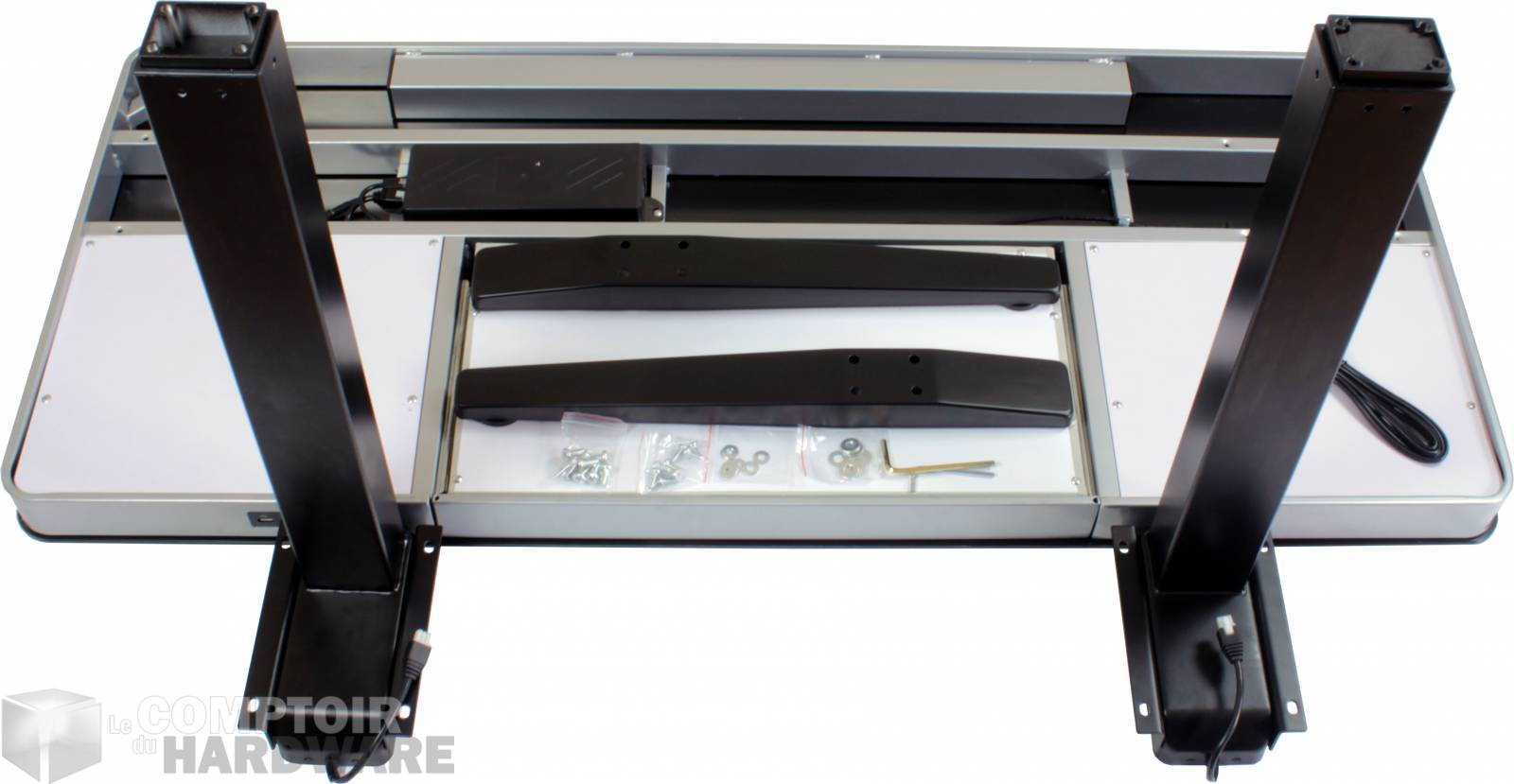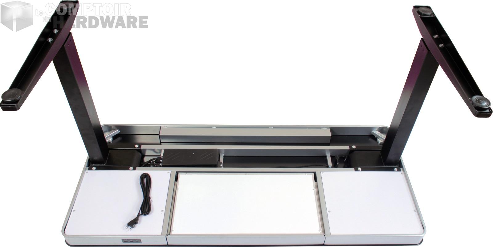 Comme nous vous le disions précédemment, le montage est très aisé et rapide, sans subtilité particulière. Aucun outil n'est requis. En plus de la base des pieds, deux grandes équerres de supports doivent être attachées de chaque côté, afin de pouvoir ensuite visser l'ensemble sous le bureau. Cela prendra au maximum 10 min. Ensuite, il faut simplement brancher le câble de chaque pied motorisé au boitier d'alimentation attaché vers le centre sous le bureau. Les prises des pieds sont visuellement identiques à des prises 6 pins PCIe de GPU ; vous y trouverez aussi un connecteur type RJ45, chargé d'alimenter par POE et de véhiculer les interactions avec le pavé de contrôle ; le reste (RGB, USB et chargeur sans fil) est alimenté avec un connecteur DC classique. Une autre prise de type RJ10 est présente sur le boitier d'alimentation, mais le manuel ne dit pas à quoi celle-ci pourrait bien servir et nous n'avions pas le nécessaire sous la main pour tester sa fonction hypothétique. Peut-être réservé au SAV ? Notez que les ports USB ne permettent pas de transférer de données vers un PC, par exemple. Enfin, le connecteur d'alimentation à brancher à une prise murale est sans terre.