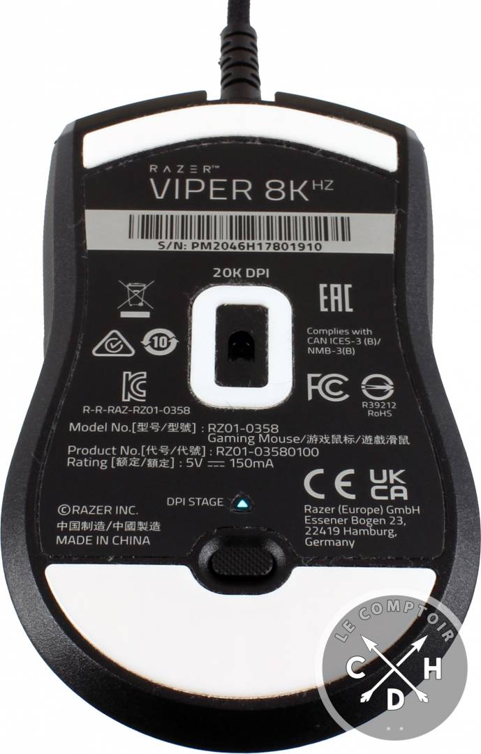 La Viper 8KHz se déplace plutôt bien et ne demandera que peu d'effort, c'était attendu pour une souris de ce calibre. Ses patins sont toujours de type 100 % PTFE. Il y a seulement trois, mais les deux situés aux extrémités sont plutôt grands et couvrent toute la largeur de la souris. Le 3e est au centre et encadre le capteur optique. Ils procurent une bonne glisse et permettent un bon contrôle de la souris dans ses déplacements, à condition tout de même d'utiliser un tapis de souris.