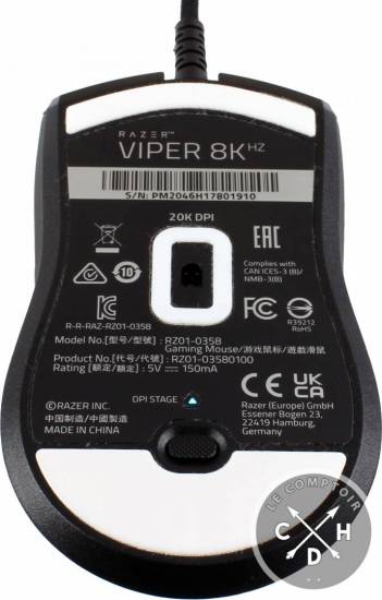 Et sinon, quel hardware sous le capot ? La Viper 8KHz embarque des interrupteurs optiques de la 2e génération signés Razer. Il n'est pas précisé s'ils ont été utilisés pour tous les boutons, mais ce que nous avons pu voir lors du démontage suggère que seuls les interrupteurs G/D en profitent, tandis que les boutons les moins « importants » sont toujours pleinement mécaniques. C'est très souvent le cas, même chez les autres fabricants. Razer a aussi doté sa nouvelle création du capteur optique Razer Focus+, une mise à jour du Razer 5G (un PMW3389 de chez PixArt, lui-même une variante customisée du célèbre PWM3360/3366). On verra plus tard le modèle qui se cache derrière cette nouvelle édition. Avec un DPI de 20 000, un tracking de 650 pouces par seconde et une accélération de 50G, la Viper 8KHz n'a pas grand-chose à envier aux autres, sauf peut-être leur DPI de 25 000 qui tend à se généraliser (mais dont l'utilité est toute relative). Mais le constructeur a estimé que les 8000 Hz sont plus importants et plus avantageux qu'un DPI (inutilement) capable de dépasser les 20 000.