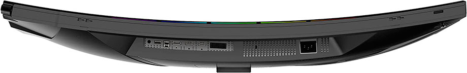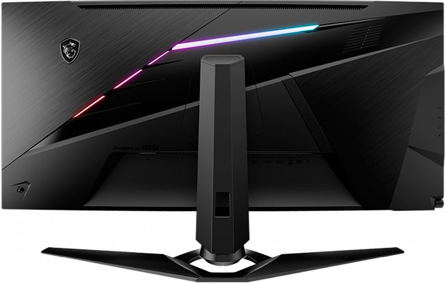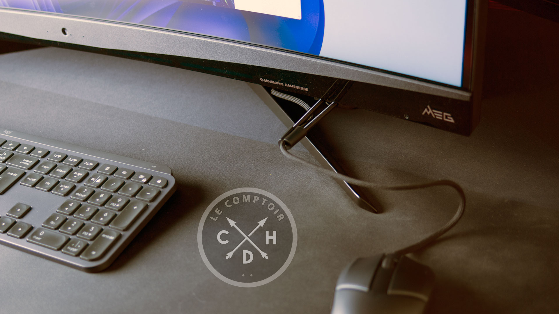 MSi a en effet intégré sur la face avant un bandeau de LED RGB, ainsi qu'un petit écran OLED dans le coin inférieur gauche. Nous détaillerons ce dernier un peu plus bas. Autant vous le dire clairement, nous ne sommes pas de grands fans des LED et encore moins de l'idée d'en coller sur la face avant. Cela a tendance à distraire l'utilisateur de l'afficheur en lui même, la bonne nouvelle vient du fait que ces diodes sont désactivables. Cela désactive cependant celles arrière situées au niveau des évents également, et qui auraient pu avoir pour le coup une utilité façon ambilight, mais il faudra faire sans si vous ne supportez pas celles à l'avant du moniteur. Dernier point, une Webcam 720P est présente juste au-dessus du bandeau lumineux. La qualité n'est pas excellente et l'angle de vision surprenant du fait de sa position, mais elle pourra dépanner.