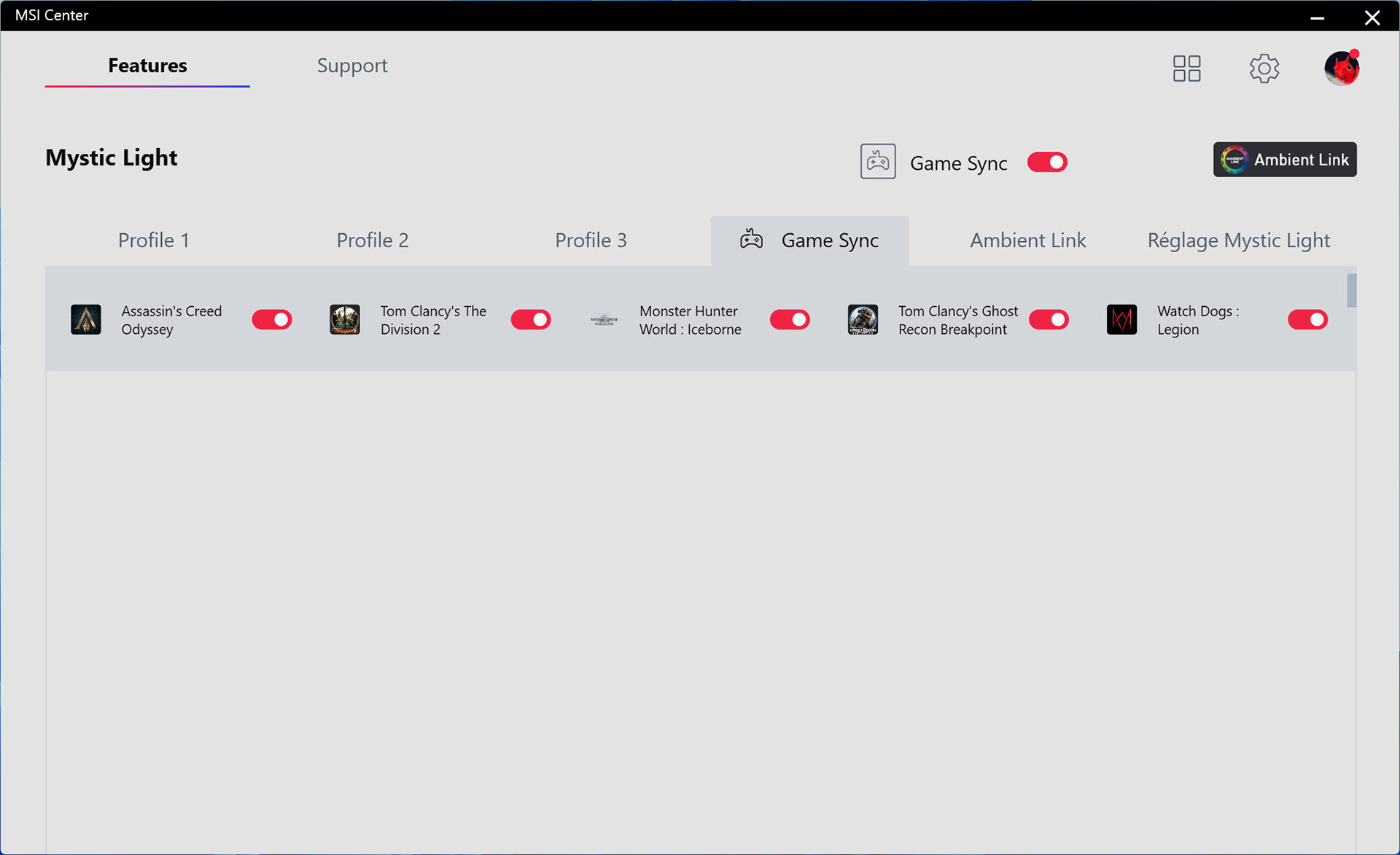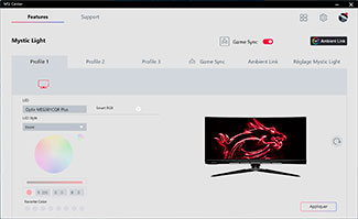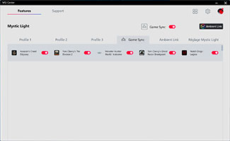 Mystic Light enfin, vous permettra de paramétrer tout ce qui est lié à l'activité des LED RVB. Il sera ainsi possible de définir précisément les couleurs et effets puis sauvegarder tout cela au travers de 3 profils différents. On notera également la fonction Ambient Link qui permettra d'adapter les LED RVB au contenu du jeu, ce qui peut conduire à améliorer l'immersion. Il faudra toutefois que les jeux soient compatibles, et il n'y en a pour l'heure qu'une poignée.