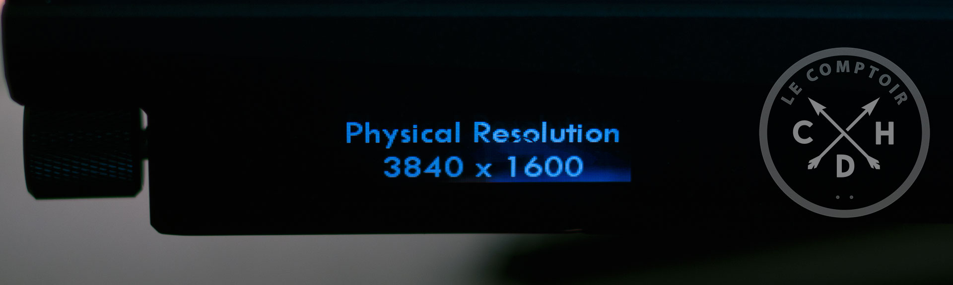 Derrière ce nom à coucher dehors, se cache un moniteur 38" au format 21:9, même si la définition fixée à 3840 x 1600, correspond plus précisément à 21,6:9. Les dimensions sont conséquentes, avec le corps de l'écran (sans le pied) affichant 89,7 cm x 42,2 cm x 12,2 cm. L'épaisseur relativement importante n'est pas entièrement due à l'épaisseur du boitier (qui est notable), mais aussi à la courbure de ce dernier. Celle-ci n'est toutefois pas très prononcée (2300R = courbure correspondant à un arc d'un cercle de 2,3 m de rayon). L'utilisation du pied fera passer la profondeur à 32,6 cm, il faudra donc prévoir la place en conséquence sur le bureau. Si la face avant laisse apparaître des bordures relativement fines, ce n'est pas le cas de celle inférieure, créant un petit "menton" façon iMac à ce moniteur.