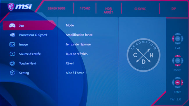 Un mot sur l'OSD. Ce dernier dispose d'une traduction en français et s'avère très ergonomique du fait de l'usage du petit joystick au dos. De nombreux réglages sont disponibles, allant de la gestion de l'image à la réactivité de la dalle, en passant par les sources d'entrée où les réglages des LED, etc. On notera en particulier la présence d'un mode anti lumière bleue qui pourra aider certains à retrouver le sommeil, mais également la possibilité d'ajouter au centre de l'écran un réticule de visée que certains petits malins pourront utiliser dans les jeux ne l'autorisant pas. Dernier point, il faudra se rendre dans le menu Setting puis overclocking DP pour pouvoir déverrouiller l'accès aux 175 Hz, sans quoi vous serez limités à 144 Hz.