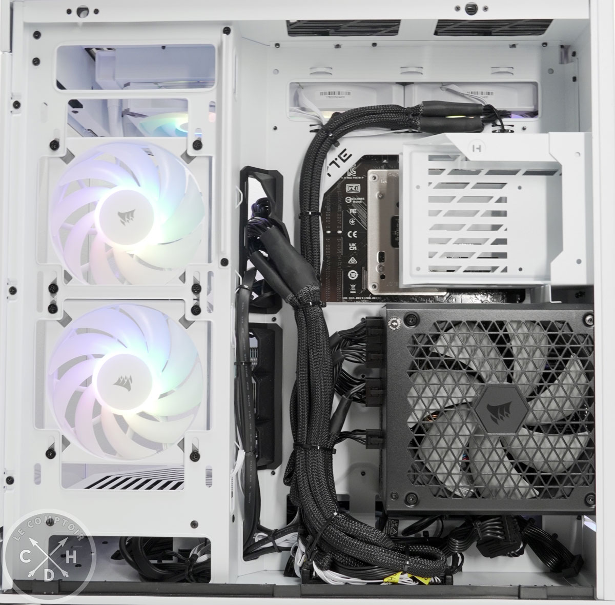Tout ce beau monde s'insère dans un écrin de chez Hyte, le Y60, blanc bien entendu. Nous agrémentons ensuite l'intérieur de quelques ventilateurs Corsair AF120 RGB Elite et du kit pour les gérer. L'alimentation se fait par un bloc Corsair RM750x 80 Plus Gold modulaire, qui sera le seul élément noir du lot.