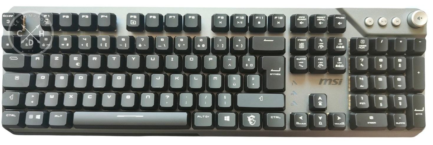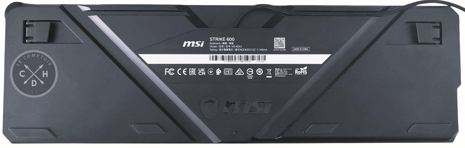 Éteint, le MSI Strike 600 est assez austère. Son châssis supérieur en alliage d’aluminium est entièrement gris anthracite, avec une finition mate, à l’exception du petit liseré noir dans la partie inférieure gauche. Les trois boutons multimédias et la molette de volume mis à part, qui sont gris clair, les touches, de style touches flottantes, sont également noires ; aucune ne se distingue vraiment par sa couleur ou sa texture (la marque mentionne tout de même des « touches octogonales exclusives » qui bénéficient d’un « revêtement d'apprêt argenté qui offre une résistance durable du lettrage » ; ça semble effectivement être le cas pour la touche dragon, mais avouons que c’est peu perceptible). Tant par les teintes que par l’aspect anguleux du châssis, l’ensemble a un look presque industriel.