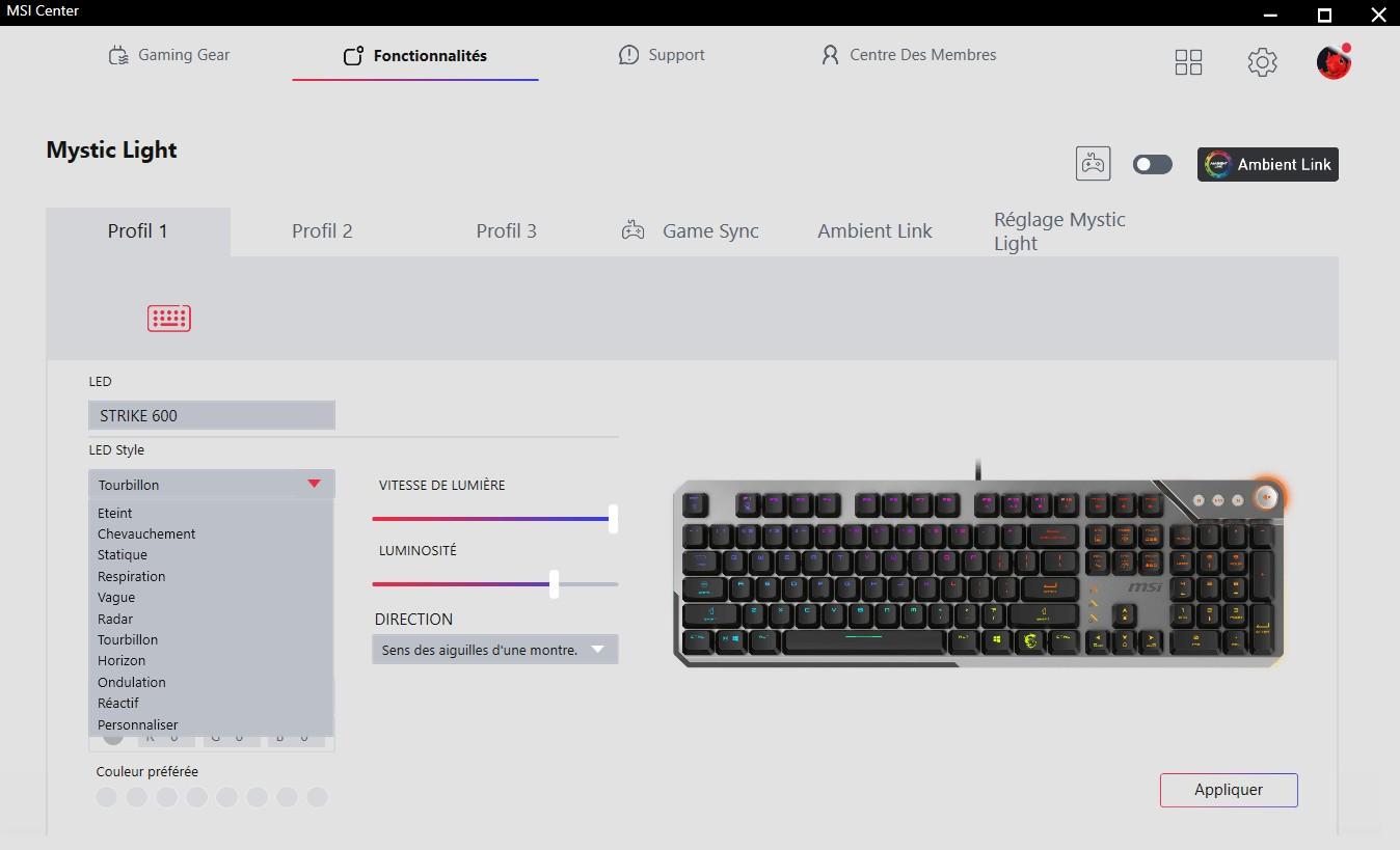 Un petit passage dans le MSI Center révèle la myriade d’options de personnalisation disponibles. L’utilisateur peut définir divers effets dynamiques et définir l’intensité sur plusieurs niveaux. Il y a clairement de quoi paramétrer à sa guise — ou juste s’amuser. La synchronisation automatique avec des jeux et aussi de la partie.