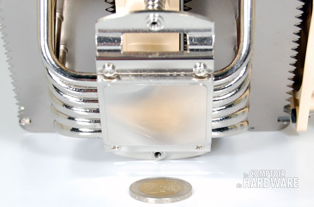 En ce qui concerne la base, pas de "Direct Touch", on reste sur une classique surface plane en cuivre nickelé, mais on note tout de même que les caloducs sont très proches de cette base : l'épaisseur de métal a été réduite à son maximum pour un échange plus rapide de chaleur entre le CPU et les caloducs. Petite déception pour les puristes : la base ne bénéficie pas d'un effet miroir et l'état de surface n'est pas parfaitement lisse. Mais Noctua fait partie des marques qui assurent que les performances avec ces microsillons sont tout aussi bonnes sinon même meilleures.