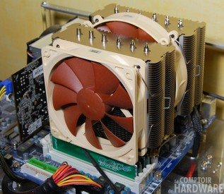 Pour finir cela se passe exactement comme pour le socket d'AMD arrivé là, on retire le ventilateur NF-P14 au centre pour avoir accès aux vis, et quelques tours de poignet plus tard le tout est solidement installé. Seul petit grief donc que nous avons constaté vis-à-vis du montage sur LGA1156 : cette installation de système de fixation sur le socket qui nécessite d'intervenir en même temps finalement de chaque côté de la carte mère et est peu pratique.
