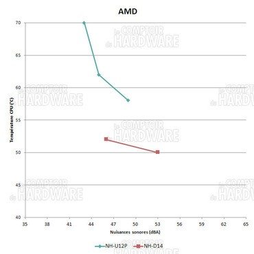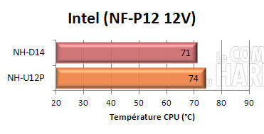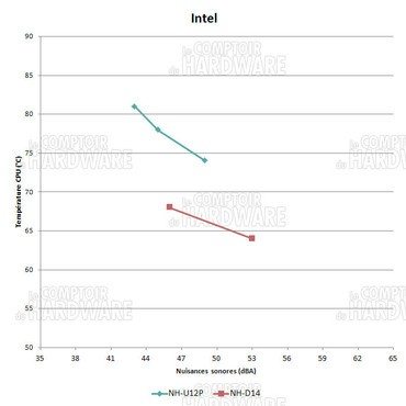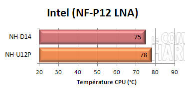 Là encore pas de surprise avec nos deux seuls concurrents, le NH-D14 comme dit en page précédente ne laisse que des miettes au NH-U12P, décidément vraiment pas dans le coup lorsqu'on lui retire son ventilateur.