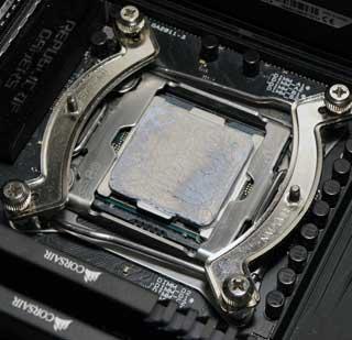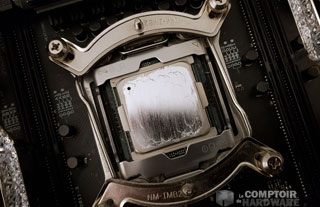 L'aspect des différents produits que nous avons en test est toujours le même : ça ressemble à une boule de mercure ! Première mise en garde, l'application qui nécessite une précision chirurgicale, puisqu'il ne faudra pas trop presser sur votre seringue pour éviter le risque d'arroser votre carte mère. La mort s'en suivra assurément si vous opérez sans avoir coupé l'alimentation ! Une petite perle suffit, on l'étale ensuite à l'aide d'un coton-tige sur toute la surface de l'IHS jusqu'à obtenir un effet miroir. La seconde mise en garde concerne le contact avec l'aluminium qu'il faut à tout prix éviter. Une réaction chimique se produit et endommagera votre dissipateur. Privilégiez une base en cuivre; le nickel peut marquer comme ce sera le cas chez nous. La dernière mise en garde concernera la garantie de votre processeur. Utiliser du métal liquide peut effacer les références inscrites sur l'IHS, ce que les fondeurs n'aiment pas. La garantie de votre CPU peut sauter.