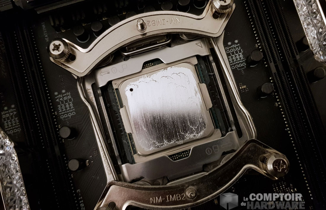 Exit donc la ligne dégueulasse en plein centre du CPU comme il est courant de le voir sur les internets. Si l'étalage n'est pas recommandé, nous appliquerons un gros point central (environ 3mm) et un point d'un millimètre aux quatre coins de notre processeur. Cette méthode est valable pour les CPU de taille moyenne sur socket LGA 2066 ou 2011 chez Intel, mais aussi les processeurs AMD. Si vous utilisez un processeur plus petit, sur socket LGA 115x, un point central de 2mm suffit. Quant au gros TR4, il devra passer à la tartinade, méthode qui s'est révélée la plus efficace. Une fois la pose effectuée, l'installation et le serrage du dissipateur répendra le produit sur toute la surface du CPU. Attention à ne pas trop en mettre, cela peut entrainer une surchauffe de votre processeur, étant donné que le contact ne sera pas optimal.
