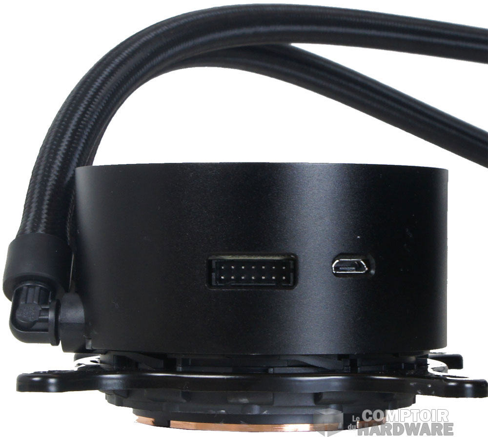 La pompe embarquée est la même sur toutes les versions. Il s'agit d'un modèle de 7ème génération de chez Asetek, censée améliorer le débit et réduire les nuisances sonores. Les dimensions restent sensiblement les mêmes que celles de l'ancienne génération, avec ici 77 mm de diamètre pour 50 mm d'épaisseur.