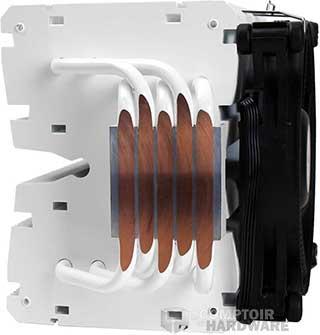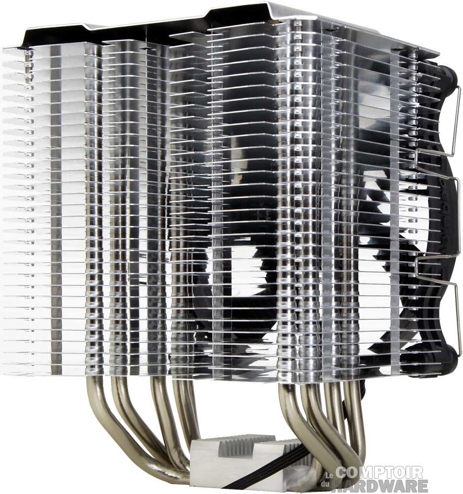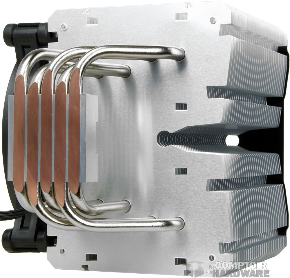 On compte tout juste 30 ailettes en aluminium sur la surface de dissipation, espacées d'un peu plus de 3 mm. La dernière ailette est surmontée d'une plaque d'aluminium emboutie, à la finition brossée, servant à cacher le haut des caloducs. Elle est de couleur grise et noire et porte le logo de la marque sur le haut. Vous remarquez le petit trou sur le haut ? Il vous servira lors du montage.