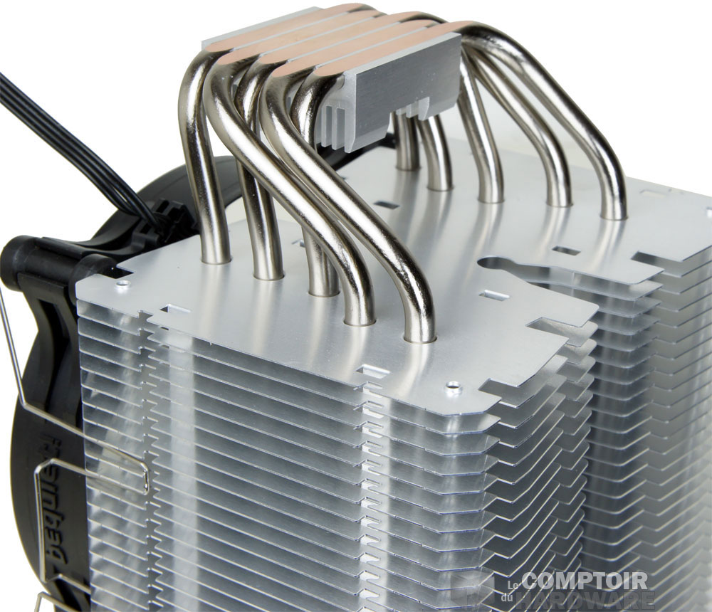 En allant plus vers le bas, nous découvrons la base du Shadow Rock 3. Elle se compose d'un bloc d'aluminium surmonté d'une quinzaine d'épaisses ailettes. Le bloc maintient en place les cinq caloducs de 6 mm en cuivre. be quiet! a choisi le direct-touch ici et la finition est très propre. Le cintrage des tubes déporte la surface de dissipation vers l'arrière, ce qui permet de ne pas empiéter sur les slots de mémoire. La place disponible entre le radiateur et la base du processeur est de 40 mm, ce qui est suffisant pour faire passer les Vengeance LED sur notre socket LGA-2011.