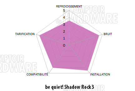 Les bonnes choses ont une fin et nous remercions encore une fois be quiet! qui s'attelle à toujours préserver nos esgourdes. Même si le Shadow Rock 3 n'est pas parfait en tout point, il a le mérite d'être très bien assemblé, soigné dans ses finitions et surtout bien équipé. Depuis quelque temps maintenant, la marque allemande revoit ses fixations. C'était l'un des points négatifs du Shadow Rock 2 d'ailleurs. La copie est revue et la mise en place est largement simplifiée sur la version 2020. S'il reste volumineux, le Shadow Rock 3 est très bien conçu, avec un déport permettant de laisser libres les emplacements de mémoire devant le socket. Si vous l'installez sur LGA-20xx, la hauteur sous le radiateur ne gênera pas non plus les slots arrières. C'était également un reproche qui était souvent fait au modèle. Le ventirad n'est pas un foudre de guerre, mais se défend parfaitement sur son segment. Il aime les flux d'air légers et sera bien plus à l'aise dans un boîtier à proximité du ventilateur d'extraction. Les nuisances sonores sont très bien maitrisées, même si le modèle est audible à fond. La régulation du Shadow Wings 2 fait le boulot, rendant l'ensemble agréable à l'usage. Reste à lui trouver de la place, puisque le bestiau est un gaillard de 163 mm de hauteur. Il risque de buter contre le panneau de votre boîtier si vous ne vérifiez pas l'espace disponible. Dans le bundle, on trouvera les fixations AMD et Intel, de la pâte thermique, le Shadow Wings 2 et surtout un tournevis estampillé be quiet! pour permettre le montage du ventirad. Côté prix, ça évolue légèrement, avec une hausse d'environ 5 €, soit un Shadow Rock sauce Vingt-Vingt à 49,90 €, ce qui reste raisonnable puisque le modèle s'attaque au milieu de gamme. À l'issue de ce test, nous attribuons 4 étoiles au Shadow Rock 3 de be quiet!, qui profite de modifications bienvenues, mais qui reste cependant un poil moins endurant que les modèles de son gabarit, souvent plus haut de gamme il est vrai.