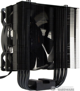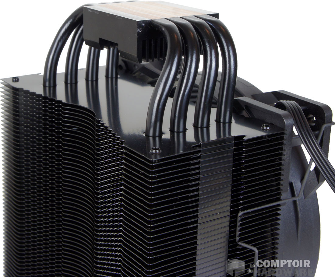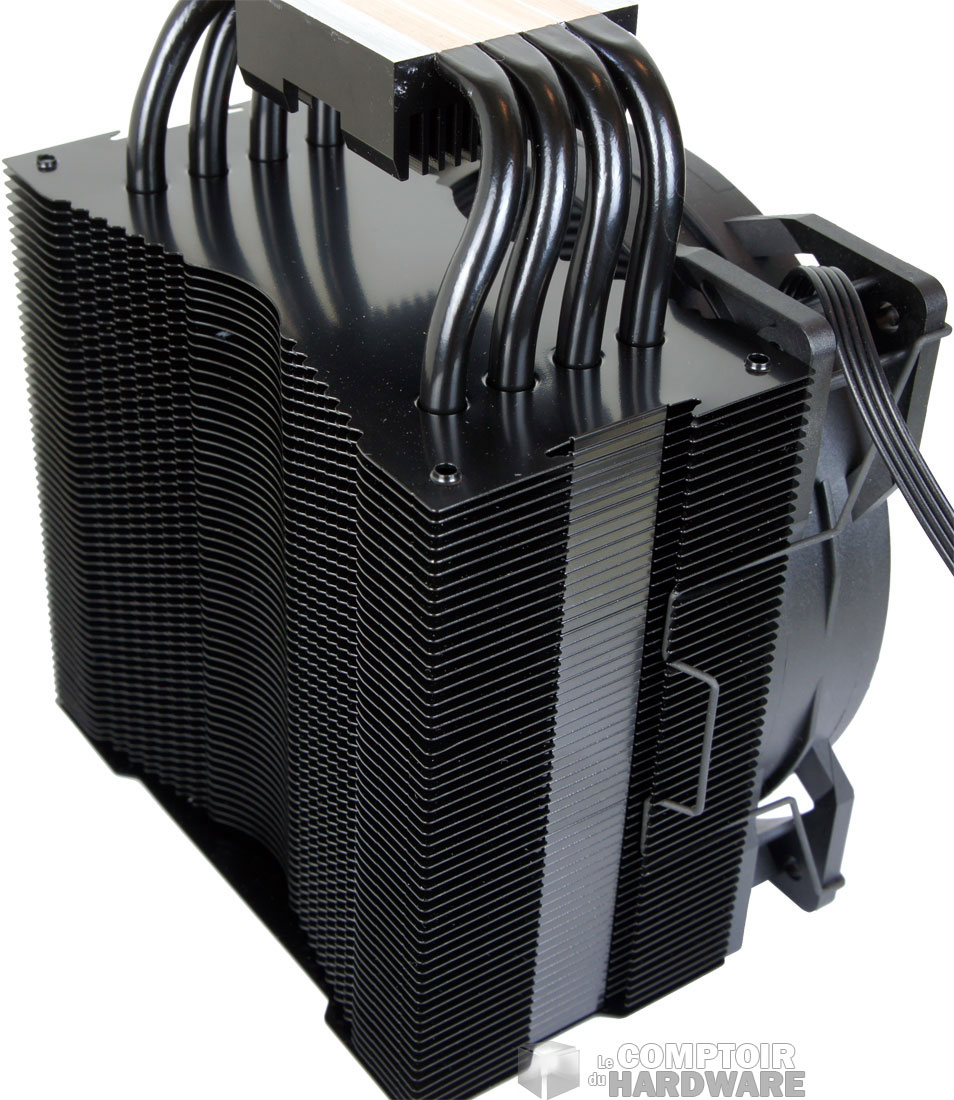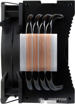 On garde les quatre caloducs pour acheminer la chaleur au travers des ailettes. Un second changement est visible et change la forme du radiateur. Il s'agit du cintrage qui permet d'excentrer la surface de dissipation pour d'une part libérer de la place pour la mémoire et d'autre part de profiter du ventilateur d'extraction pour maximiser l'évacuation de chaleur.