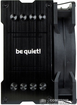 La surface de dissipation est composée de 55 ailettes (7 de plus), terminée par une plaque en aluminium portant le logo de la marque. Petit détail, il était positionné dans le sens de la largeur sur le premier Pure Rock, là nous sommes dans le sens de la profondeur, ce qui permet de lire le nom une fois le radiateur en place dans le PC. be quiet! soigne la finition avec des bouchons de caloduc. Les ailettes se resserrent au centre et gardent une structure dentelée comme l'apprécie la marque.
