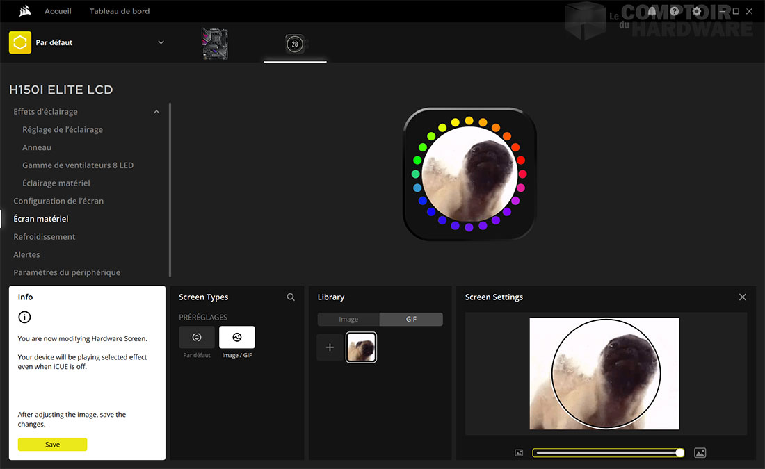 Sans entrer dans les détails des réglages, sachez que la tête de pompe et les ventilateurs se pilotent indépendamment. Pour ce qui est de l'affichage, plusieurs effets sont disponibles, comme vous pouvez le voir ici. L'écran affichera également quelques informations, comme la température du liquide ou la vitesse de rotation de la pompe. Mais le plus drôle reste encore et toujours l'utilisation d'images animées !! Par contre, le logiciel ne propose pas d'option de rotation de l'écran... Si vous avez placé le bloc à l'envers, il restera à l'envers ! Mais Corsair nous indique que l'option sera disponible lors d'une mise à jour prochaine. Ouf !
