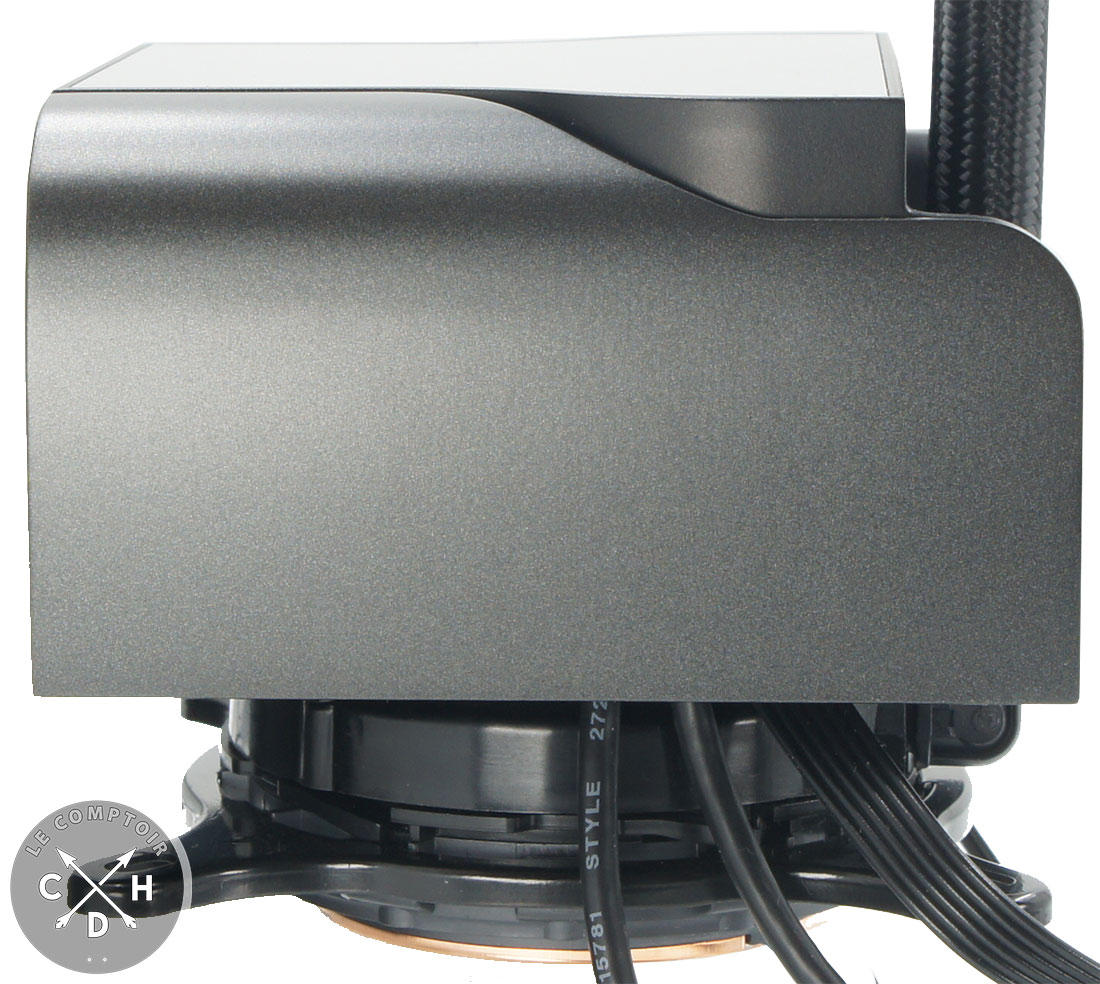 400 mm de tubes partent jusqu'au bloc de refroidissement. Bloc somme toute assez imposant, il faut le dire. L'encombrement est important pour un AIO, puisque nous avons un ensemble de plus de 80 mm de hauteur et 95 mm de côtés. Le capot supérieur est aimanté. Il couvre un écran IPS de 2.4" qui affichera toutes sortes d'informations (Température, infos config, heure, météo...) ou d'images/vidéos. Il y a tout un tas de câbles qui passe là-dessous et pour cause, vous en aurez aussi besoin pour faire tourner le ventilateur de 60 mm sous cet ensemble. Il permet de rafraîchir les alentours de votre socket.