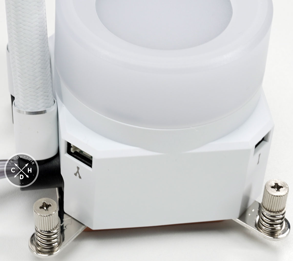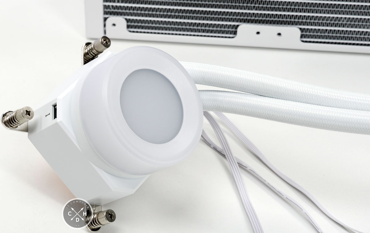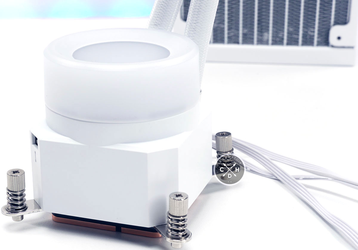 Pour le montage, vous n'aurez pas grand-chose à faire puisque le kit arrive prééquipé de ses ventilateurs. Il vous faudra apprêter votre socket - Intel LGA 115x/1200/1700, et AM4/AM5 chez AMD - et visser votre kit dessus. L'installation sur les sockets AMD nécessite de changer le système au préalable, puisque le kit est paré pour Intel. Un câble Power-SATA, un connecteur PWM et un USB interne seront nécessaires pour alimenter et piloter l'ensemble. Il n'est pas nécessaire de brancher les câbles de régulation et de gestion de la couleur, si vous utilisez le logiciel. Si vous ne souhaitez pas vous embarrasser d'un énième soft de contrôle RGB, utilisez les câbles livrés.