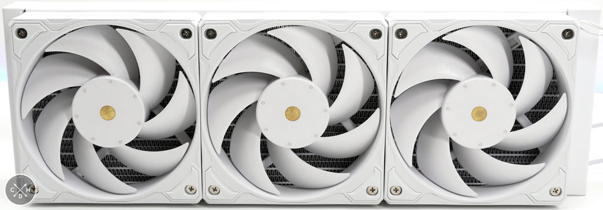 La ventilation qui est chargée d'évacuer la chaleur est dérivée des P28 de la marque. On retrouve un mode chainable via un câble spécifique, un cadre épais équipé de patins antivibrations, et une ailette à 8 pales en fibre. On retrouve un unique câble pour la régulation, ainsi qu'un switch à deux modes High ou Low. Le trio pourra ainsi tourner entre 200 et 3000 tr/min (H), ou limiter la vitesse à 2300 tr/min (L). La pression statique max est comprise entre 4.15 et 6.99 mmH2O, et le volume maximum d'air brassé sera de 139.1 ou 186.2 m3/h selon le mode choisi. On vous a dit que ça arrivait prémonté d'ailleurs ?