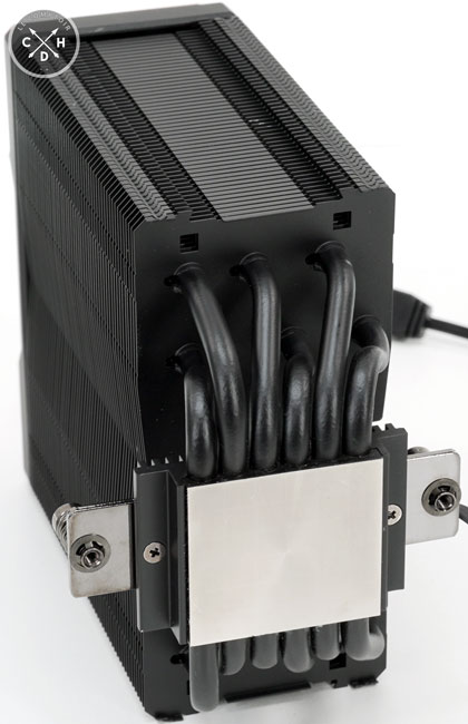 La surface de dissipation comprend 50 ailettes en aluminium, traversées par six caloducs de 6 mm de diamètre. Ils se rejoignent à la base du ventirad. Pas de direct touch sur ce modèle, mais une base pas tout à fait carrée en cuivre nickelé (42 mm x 38 mm).