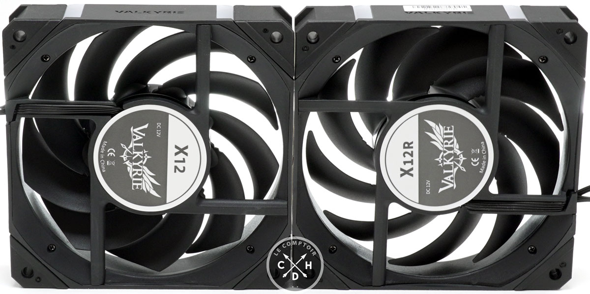Les ventilateurs utilisés pour évacuer la chaleur sont deux modèles Valkyrie : un X12 et un X12R avec l'hélice retournée. Leur vitesse de rotation est comprise entre 800 et 2150 tr/min, pour une pression statique de 3,14 mmH2O. Ils brasseront jusqu'à 136 m3 d'air à l'heure. Il sont tous deux équipés de patin antivibrations et de coins RGBisés. L'éclairage reste assez doux et plutôt discret.