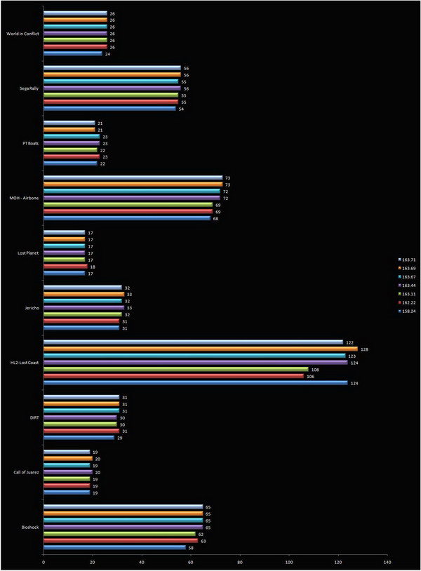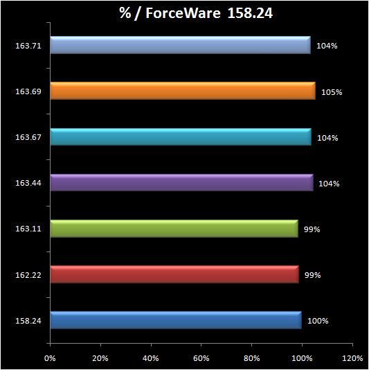 Les 4 derniers drivers sortis sont "aux pouillièmes" près ex-aequo et il en est de même entre les 3 anciens. Pour autant les 162.22 et 163.11 paient un lourd tribu à leur contre-performance sous HL2 sans quoi ils auraient été beaucoup plus proche du quatuor de tête. Ce dernier se situant 4 à 5% devant les drivers référents à savoir les 158.24.
