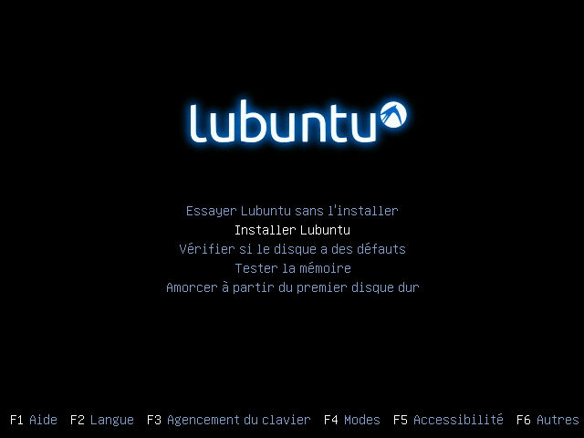 La première option permet d'essayer Lubuntu sans l'installer. C'est ce qu'on appelle un Live OS, il se lance directement depuis son support en n'utilisant que la RAM de la machine, rien n'est écrit sur le disque dur. Ça permet de se faire une idée avant d'envisager une installation complète. Ici, on veut installer donc «Installer Lubuntu».