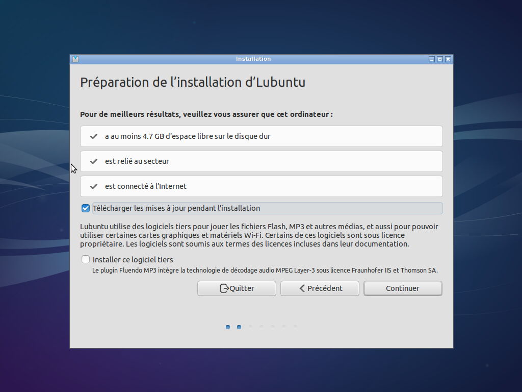 Petite vérification pour être sûr que la machine a ce qu'il faut pour faire tourner l'OS, si quelque chose ne va pas, il vous le dira. Cochez la case «Télécharger les mises à jour pendant l'installation», si vous êtes connecté à Internet, ça vous évitera une longue session de mise à jour à la fin. Pour les logiciels tiers, on vous laisse choisir, ça n'a rien de dangereux, c'est pour lire les MP3, ça n'est pas libre donc c'est proposé à côté. Continuer.