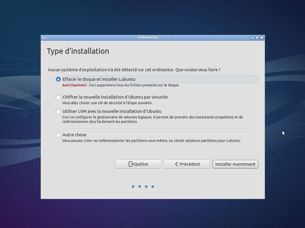On va prendre pour exemple Lubuntu, 8 étapes pour installer le système, très peu de choses à réfléchir (mais possibilité de creuser plus si on veut s'y intéresser), bref, de quoi faire pour ne pas effrayer un novice. On aurait pu prendre n'importe lequel des 5, mais le choix se porte sur Lubuntu, car il présente une installation équivalente à toutes les autres install de systèmes basés sur Ubuntu, ainsi que quelque chose de proche de Debian et de SUSE