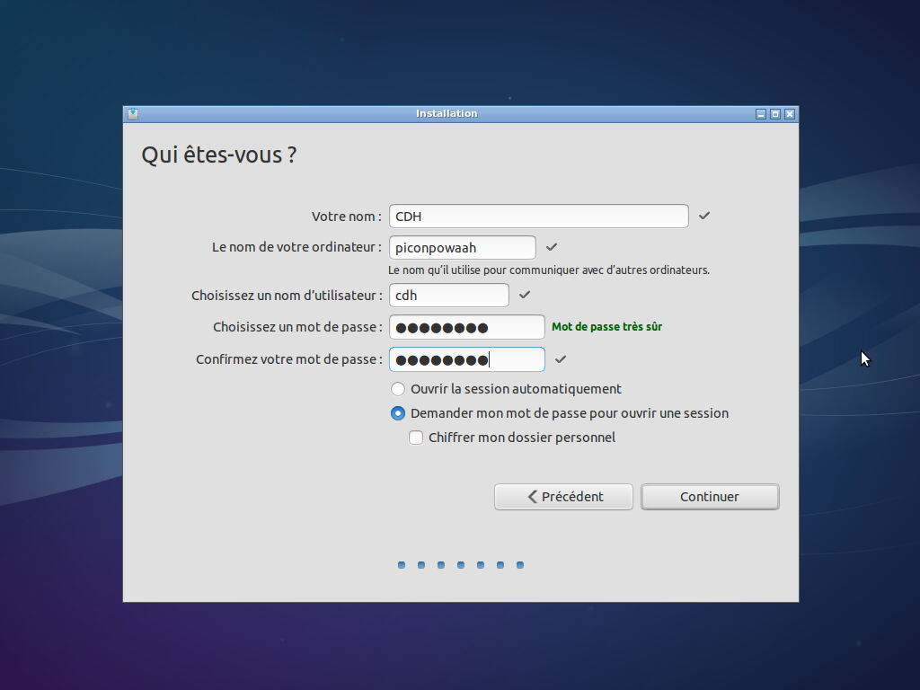 À la suite vont vous être demandés votre fuseau horaire et la disposition de votre clavier, tout est détecté automatiquement et il n'y a donc pas d'intérêt à coller des images de tout cela. La dernière question qui va vous êtes posée est le nom que vous voulez donner à votre machine et le nom d'utilisateur que vous utiliserez pour vous connecter.