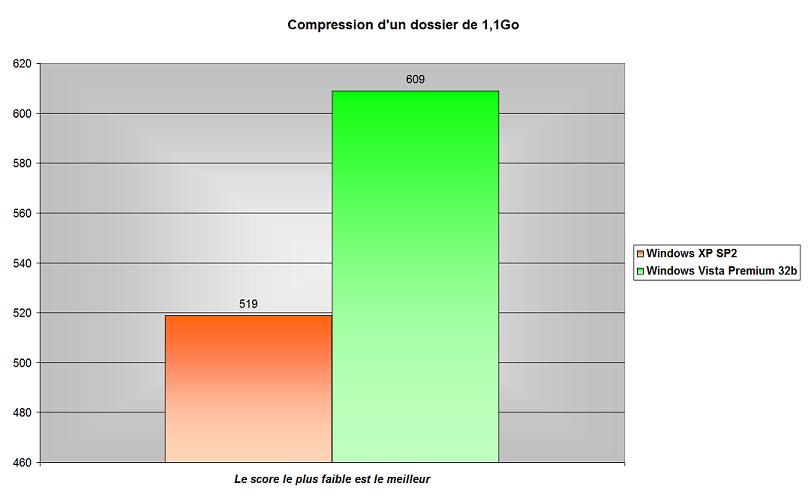 Et comme vous pouvez le voir, cette action s'est révélée plus longue sous Vista de 90 secondes. Est ce du à l'OS directement ou à un fonctionnement moins optimisé de winrar, toujours est-il que c'est plus long sous Vista. A noter que la tâche de compression sur des éléments plus petit (d'usage plus courant), il n'y aucune différence.