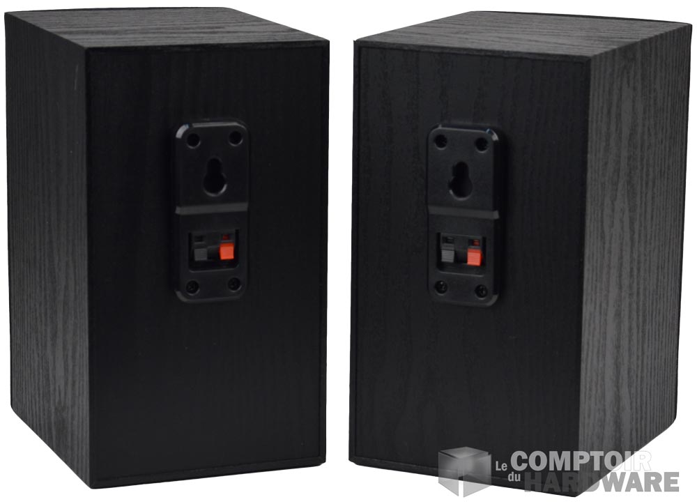 La finition des enceintes est faite d'un placage en plastique à effet bois rainuré noir. Sous cet habillage, on retrouve une structure en panneaux de fibres collés, de qualité moyenne et d'environ 7mm. La face avant des satellites n'a d'ailleurs pas de finition à proposer sous les grilles de protection. A l'arrière de ces trois éléments, on retrouve de classiques connexions à poussoir pour insérer les cables et un système de fixation mural sommaire et n'offrant aucun serrage. En dessous, 4 petits patins en caoutchouc assurent correctement la stabilité des enceintes, tout en absorbant une partie des vibrations.