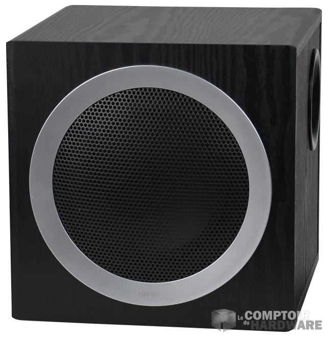 Le subwoofer offre le même type de finition, avec un évent sur le côté droit pour le bass reflex. Sa façade non-amovible est faite de métal serti d'un cercle en plastique. Comme pour les satellites, on retrouve à l'arrière de simples connexions à poussoir en plastique et dessous des patins en caoutchouc (plus épais que ceux des satellites) pour l'absorbtion des vibrations. Avec un poids de près de 8kg, ce caisson semble stable et apte à encaisser les 45 W RMS de son haut parleur de 8 pouces (21cm).
