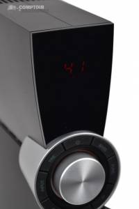 Côté module de contrôle, c'est le plastique qui prédomine avec une finition oscillant entre le "assez brillant" et le "plutôt mat". A l'arrière, on a les connexions pour les enceintes, l'interrupteur, les entrées "PC" en RCA et "Aux" en mini-jack 3,5, ainsi que les ports USB et SD. Sur le côté droit, deux embases mini-jack accueillent un répétiteur de l'entrée auxiliaire et une sortie casque. En façade avant, on trouve un gros bouton de volume offrant une bonne résistance. Il est entouré de huit touches larges donnant accès à l'allumage, au réglage des fréquences, à la sélection d'entrée et à quelques fonctions basiques de navigation et de lecture. Juste au dessus, l'affichage se fait sur quatre 8-Digits, ce qui limite pas mal le niveau d'information. Ainsi, la navigation dans les fichiers et dossiers de vos clés USB et autres cartes SD est juste une horreur. Impossible de savoir dans quel dossier vous êtes, ni le titre du morceau que vous êtes en train de lire.
