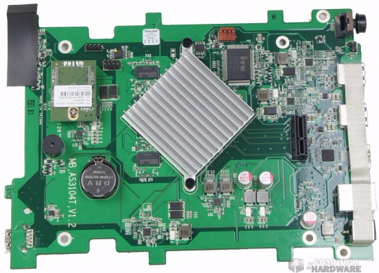 On dissèque la bête pour voir ce qu'il se cache dans ses entrailles. Nous découvrons un PCB plus fourni, Celeron oblige. Le dissipateur est plus imposant que sur l'AS1004T et nous remarquons la présence de quatre puces de 512Mo de mémoire soudées à l'arrière de la plaque. La mémoire ne sera pas extensible.