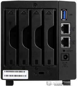 On reste sur un petit boîtier de 120mm de hauteur, 105mm de largeur et 142mm de profondeur pour 660g. Il dispose de quatre baies de 2,5" pour une capacité totale de 20 To. Comme pour la précédente évolution, seul le nom change sur la façade. Vous trouverez toujours les USB 3.0 et les deux ports RJ45 sur ce modèle